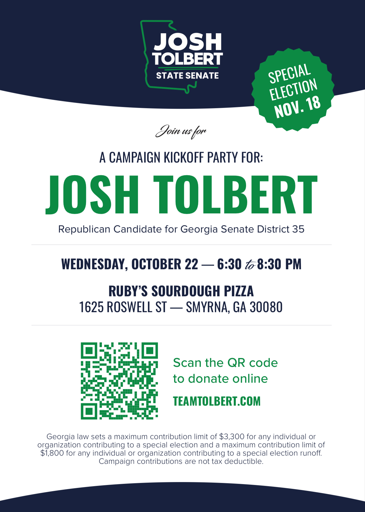 Join Josh and Team Tolbert for our campaign kickoff party at Ruby’s Sourdough Pizza in Smyrna.